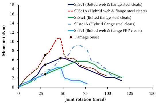 Firstly, the strength of the joint is evaluated in terms of moment capacity. Figure 9a presents the moment evolution at each positive and negative loading cycles. The moments are obtained from peak points in cyclic backbone curves in Figure 4, Figure 5, Figure 6, Figure 7 and Figure 8. The moment in positive and negative regions followed a similar pattern. Damage initiated at 4th or just before 5th cycle in all specimens except specimen with FRP cleats (SFFc2), where it happened at the 3rd cycle. Overall, the moment capacity of cyclic tests was similar to monotonic tests. Hybrid (bolted and bonded) joints generally attracted higher moments compared with bolted joints. The specimen with FRP cleats showed the lowest moment of all tests. The ratio of maximum over damage onset cyclic moment was about 2.5 for bolted joints and 1.5 for hybrid bonded and bolted joints. This indicates that adhesive bonding delays initiation of damage in FRP cleats and members.
