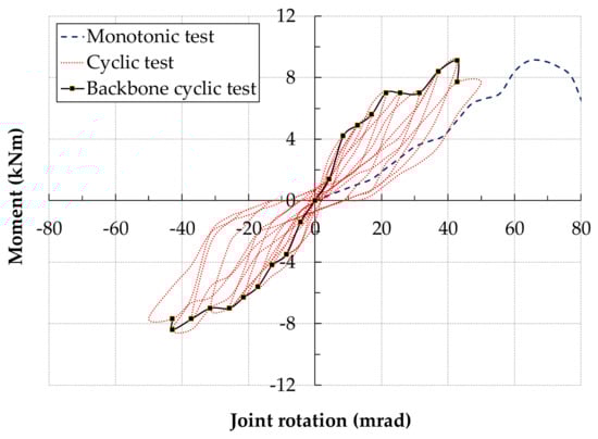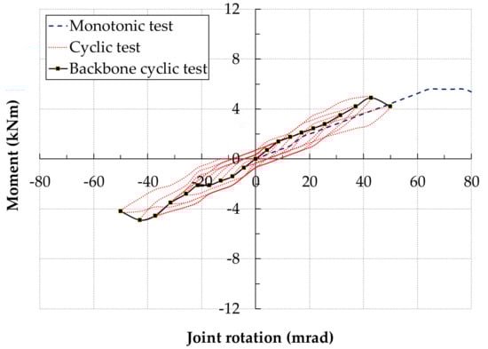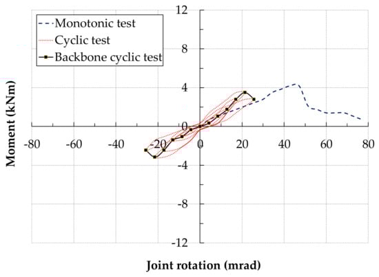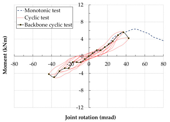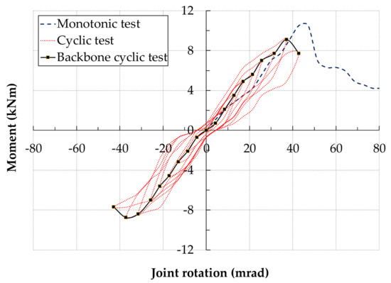 The behaviour of beam-to-column joint is studied through moment-rotation hysteresis curves. For comparison, moment-rotation curves from companion monotonic tests in [12] are given in Figure 3. Moment-rotation hysteresis curves for each specimen under cyclic loading are presented in Figure 4, Figure 5, Figure 6, Figure 7 and Figure 8. These figures also show companion monotonic moment-rotation response and cyclic backbone or reference skeleton curves. Backbone curves are produced by linking together peaks of full cycles. A full cycle comprises compression and tension half cycles. In Figure 4, Figure 5, Figure 6, Figure 7 and Figure 8, monotonic curves are shown by dashed lines, cyclic curves by dotted lines and backbone curves by solid lines with markers.