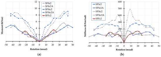 Secondly, the stiffness of each joint is assessed at each rotation increment. The stiffness evolution of the cyclic tests is presented in Figure 9b. After first couple of cycles, the stiffness started to decrease in all specimens. Tests with hybrid joints using adhesive bonding exhibited higher stiffness compared with bolted only joints. Compressive and tensile cyclic regimes resulted in almost similar stiffness except SFStc2A specimen, where reversed cyclic loading had 20% lower stiffness than the positive loading half cycle.