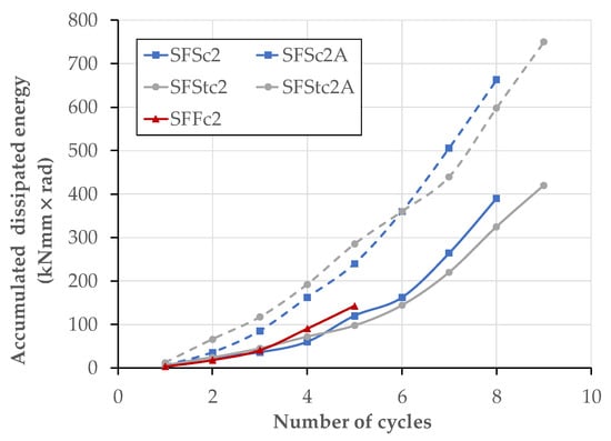 Thirdly, the cyclic performance of each specimen is evaluated by plotting the accumulated dissipated energy against number of cycles in Figure 10. The dissipated energy at each cycle is calculated as area enclosed by the moment-rotation hysteretic loop for each test. The accumulated dissipated energy is cumulative sum of each cycle. For example, 4th cycle is addition of dissipated energy from 1st to 4th cycles’ moment-rotation hysteresis curve. The hybrid joints (SFSc2A and SFStc2A) presented the best overall performance in terms of dissipated energy. The final accumulated dissipated energy for specimen with hybrid joints, SFSc2A and SFStc2A, was about 70% and 78% higher than bolted only specimens SFSc2 and SFStc2. The energy performance of web and flange cleated, and flange cleated joints was almost similar. This reinforces our conclusion earlier that use of web cleats is redundant; flange only cleated joint will perform equally well. FRP cleated joint performed poorly with final accumulated dissipated energy about half of the corresponding joint with steel cleats.