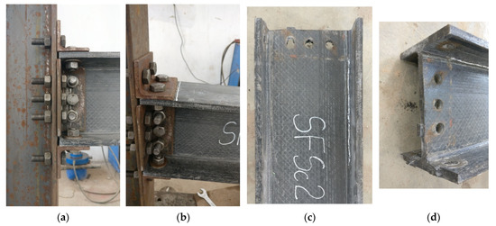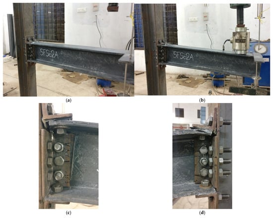 For hybrid–adhesively bonded and bolted joint SFSc2A, the failure was due to adhesive debonding in the cleated region of the beam followed by shear-out failure in the bolted region of the FRP beam. Figure 12a,b show undeformed and deformed SFSc2A joint. The damage onset was identified by the visible cracking in the web-flange interface of the beam. The cracks progressed in the beam along with acoustic emissions in succeeding loading cycles. After reaching the ultimate moment capacity, the adhesive layer failed suddenly with visible separation of the steel cleat from the FRP beam, as seen in Figure 12c,d. The final failure was due to shear-out failure in bolted region of both flange and web of the beam. The adhesive bonding failed due to shear near the steel flange cleats by prying action. The shear-out failure in the beam was delayed by adhesive bonding.