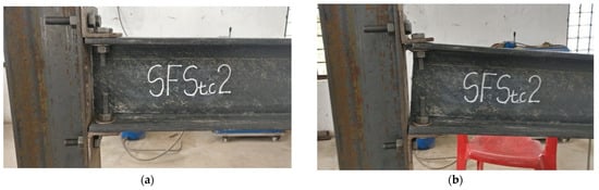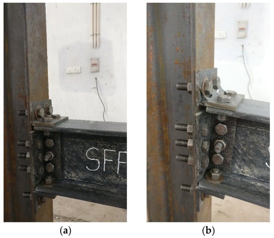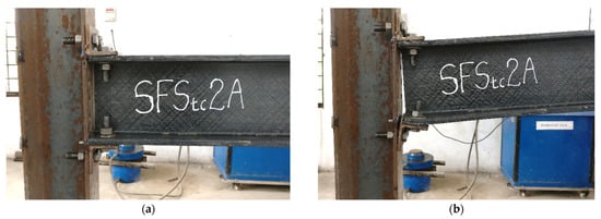 The failure modes observed in the joints were shear-out failure in SFStc2 and adhesive debonding followed by shear-out failure in SFStc2A. For the flange cleated joint SFStc2, the damage onset started in the beam flange, which was identified by slippage of tight-fitted bolts in the holes. This was accompanied by acoustic emissions too. In the subsequent loading cycles, the top and bottom flange of the beam experienced excessive shear-out leading to failure. Figure 14a,b show undeformed and deformed shape of the joint SFStc2. The applied moment at the joint creates out-of-plane forces in the connected members, which is taken by the flange cleats alone. The prying forces due to cyclic loading cause shear-out failure in the top and bottom flanges of the beam, whereas in the case of monotonic loading shear-out failure is visible in the top flange only.
