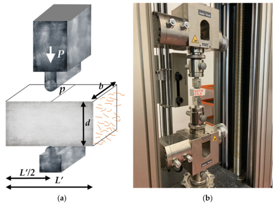 3PBT carried out at the LPMS of L’Aquila. (a) Notch geometry adopted in the tests; (b) setup of a specimen with the Zwick Roell hydraulic machine used for applying the load under displacement control.