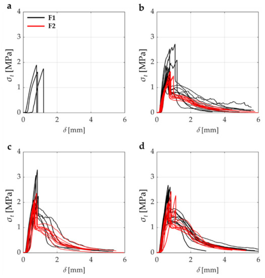 A strengthening of the matrix with Sisal fibers yarns, impregnated with a water-based resin and included in an inorganic matrix based on natural lime, was tested under both tensile and single-lap shear tests [38]. The results of the tests carried out on the mechanical characterization of the composite with impregnated yarns, showed an elastic-brittle behavior with a higher tensile strength with respect to dry fibers yarns (a difference of about 15%), caused by a greater uniform stress distribution among the fibers. In single-lap shear tests, a progressive tensile failure of the yarns was always attained, without any sliding mechanisms at the masonry–mortar interface. This behavior was due to the adequate bond length (260 mm) that avoided debonding or sliding failures.
