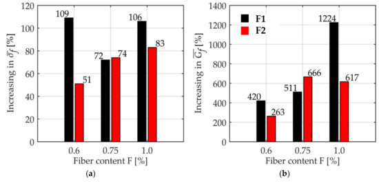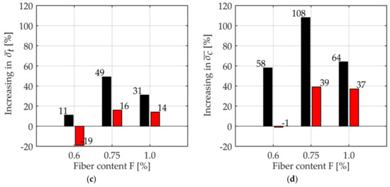 One can observe that the specimens with fibers type F2 (Figure 21a,b) have a greater number of fibers, as compared to the ones with fiber type F1 (Figure 21c,d).