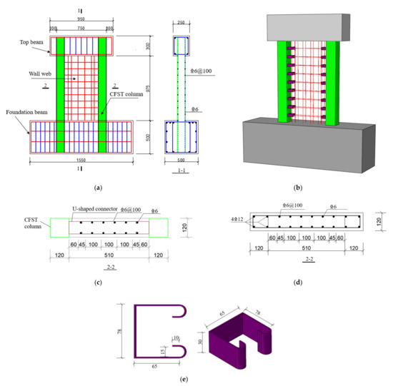 The configurations and reinforcing details of the specimens with a shear span ratio of 1.5 are shown in detail in Figure 1, where the web height of the composite shear walls is 975 mm, and the cross-section is 750 mm × 120 mm (Figure 1a). Two CFST columns with the same side length of 120 mm and thickness of 3 mm were installed in the composite shear wall (Figure 1b). In addition, to fix the wall and apply the load, a foundation beam with a cross-section of 450 × 500 mm2 and a top beam with a cross-section of 250 × 300 mm2 were designed. To ensure reliable connections between the CFST columns and the shear wall web, U-shaped connectors [46] were also welded to the steel tubes (Figure 1e). The web height of the CFST-6 specimen was 600mm, while the other parameters were kept the same as the test specimens mentioned above.