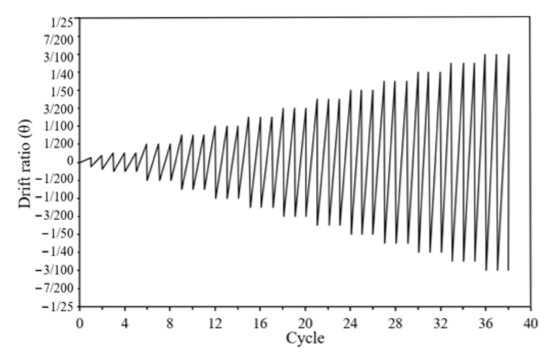 All shear wall specimens were subjected to horizontal low-cyclic loading under constant axial force. After the test began, a corresponding axial load was exerted on the loading beam and then loaded horizontally. Horizontal loading was controlled by displacement, and the loading system is shown in Figure 3. The displacement was expressed as the drift ratio θ, which is defined as the ratio of the lateral displacement at the loading point (Δ) to the height of the loading point above the wall base (H). The yield drift ratio θym was designated as 1/400 according to the research in the literature [50]. Before the yield drift ratio θym, the rotation levels of 0.5 θym and 0.75 θym were imposed. After the yield drift ratio θym, three loading cycles were repeated at each drift level according to 1θym, 2θym, 3θym and so on. When the axial force could not be maintained or the lateral force degraded below 85% of the peak lateral force, the test was stopped.
