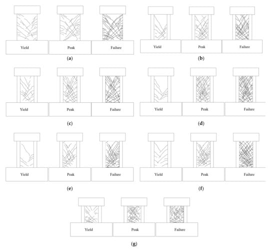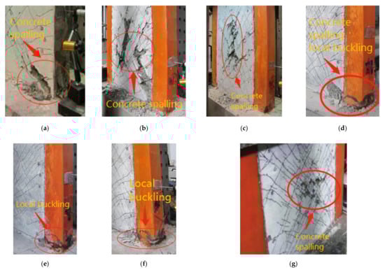 The failure process of all specimens: (a) RHC-0; (b) CFST-1;(c) CFST-2; (d) CFST-3; (e) CFST-4; (f) CFST-5; (g) CFST-6.