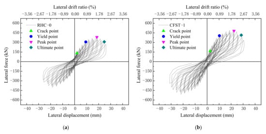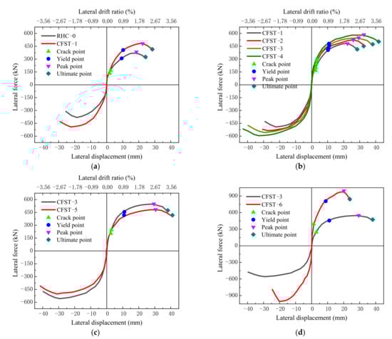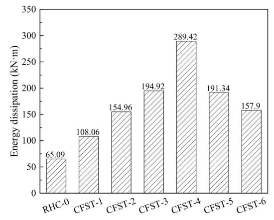Figure 7a compares the skeleton curves of specimens with different frame styles. Compared to the RHC-0 specimen, the CFST-1 specimen had a larger envelope. In addition, the slope of the CFST-1 specimen’s curve was larger than that of the RHC-0 curve at the initial loading stage, which indicates that the initial stiffness of the CFST shear wall was larger than that of the RHC curve.