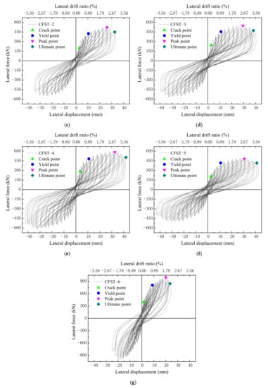 The hysteretic curves: (a) RHC-0; (b) CFST-1; (c) CFST-2; (d) CFST-3; (e) CFST-4; (f) CFST-5; (g) CFST-6.