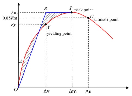 By connecting the peak points of each loading increment in sequence on the hysteresis curve, lateral force versus lateral displacement skeleton curves of the specimens could be obtained, as shown in Figure 7. The effects of the frame type, steel fiber volume ratio, axial compression ratio and shear span ratio on the bearing capacity and elastic stiffness of specimens can be clearly observed. In the elastic stage, the force and displacement were linear. After cracking, the curve had an obvious turning point, showing stiffness degradation. With the increase in displacement, the force increased further until the peak point was reached. After this, the curve suddenly dropped as the specimen was tested to failure. Table 4 lists the strength and displacement at different characteristic points. Fy and Δy (yield displacement) were determined using the energy equivalence method [51], as shown in Figure 8.