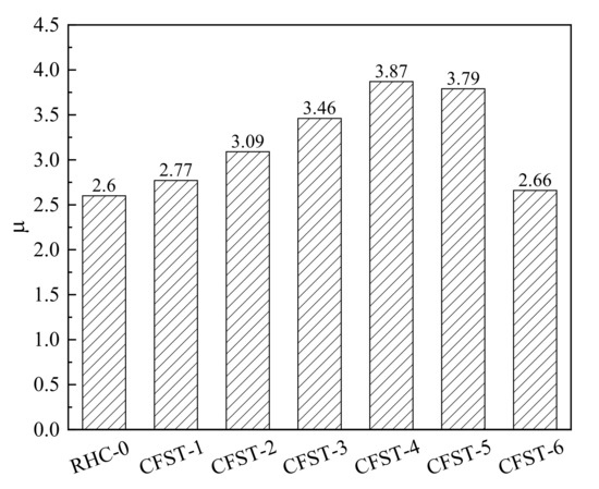 Figure 7c gives the skeleton curves of specimens with different axial compression ratios. The two specimens show similar initial stiffness. Compared with the CFST-5 specimen, the cracking force and yield force of CFST-3 were increased by 21% and 9%, and the corresponding cracking displacement and yield displacement were increased by 14% and 2%.