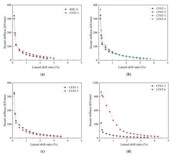 Figure 11c shows the effect of the axial compression ratio on the stiffness degradation of specimens. The initial stiffness of CFST-3 and CFST-5 specimens was similar. However, in the later loading process, the stiffness degradation rate of the CFST-3 specimen was more significant.