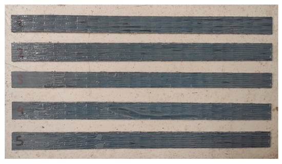 Investigated specimens (MRT-MF_1; t = 1.63 mm, b = 15.74 mm, MRT-MF_2; t = 1.74 mm, b = 17.26 mm, MRT-MF_3; t = 1.71 mm, b = 14.68 mm, MRT-MF_4; t = 1.65 mm, b = 16.56 mm, MRT-MF_5; t = 1.78 mm, b = 15.95 mm).