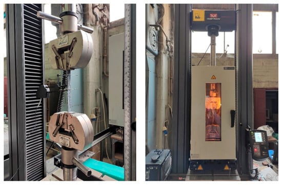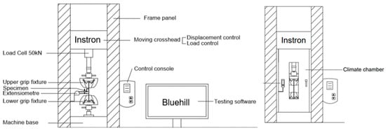 The Instron machine was equipped with an electric furnace for the heating of the specimens (see Figure 2). The maximum operating temperature of the furnace is 260 °C, and the applied heating rate was 10 °C/min. The experimental setup for both room and elevated temperatures is shown in Figure 3.