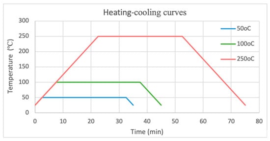 Temperature–time curves of thermal loading before the tension testing (heating process, holding time 30 min at 50, 100 and 250 °C, cooling process to RT = 25 °C).