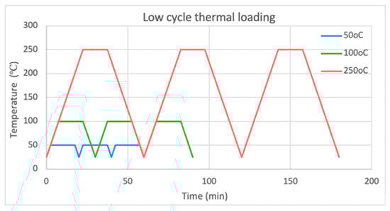 Time–temperature curves for cyclic thermal loading of max 3 cycles under constant tensile load (heating process, holding time 15 min at 50, 100 and 250 °C, cooling process to RT = 25 °C).