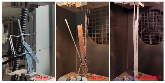 MCT50-MF_1 was the only sample that managed to complete three heating–cooling cycles before failure. The maximum temperature of each cycle at this test was 50 °C. After the thermal cyclic loading, MCT50-MF_1 was tested under monotonic tension and it failed because of the fracture of the fibers. MCT100-MCTF_1 failed at the heating process at 64 °C, MCT100-MCTF_2 failed at the cooling process at 31 °C, MCT250-MCTF_1 failed at the heating process at 61 °C and MCT250-MCTF_2 failed at the heating process at 151 °C. The first two of these samples were supposed to be exposed to a maximum temperature of 100 °C and the last two to a maximum temperature of 250 °C. The sample failure happened because of the fibers’ fracture. Additionally, the fibers of the specimens MCT100-MCTF_2 and MCT250-MCTF_2, which remained at elevated temperatures for more time, separated from each other more.