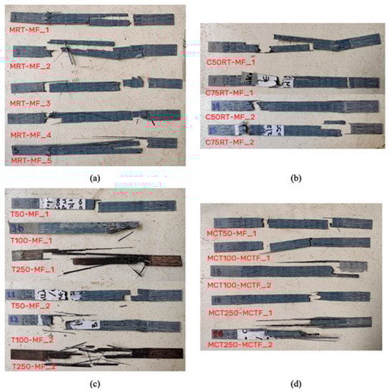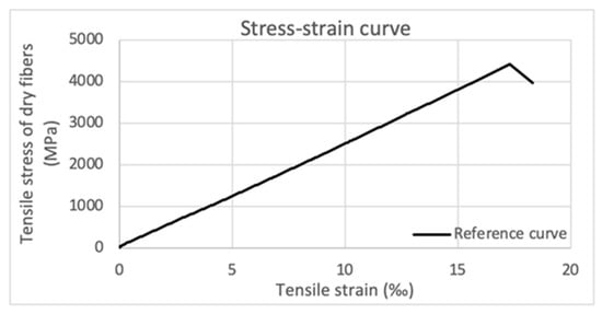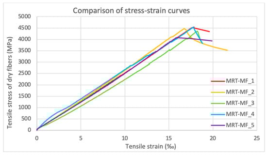The stress–strain curves of the control specimens MRT-MF_1-5 are shown in Figure 7. All five specimens showed a similar linear elastic behavior. The average tensile strength, calculated at the thickness of dry fibers, was measured equally to 4410.82 MPa with an equivalent average ultimate strain of 17.29‰. The average modulus of elasticity of dry fibers was recorded equal to 255.12 GPa. The failure of the samples was brittle and it happened because of the fracture of fibers.