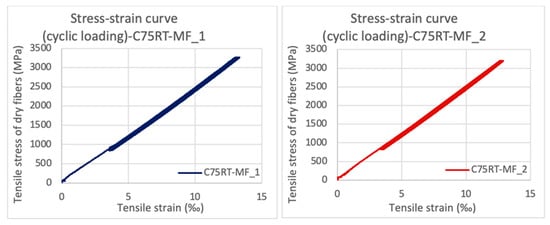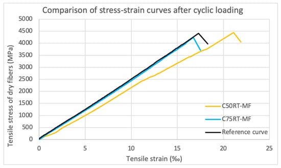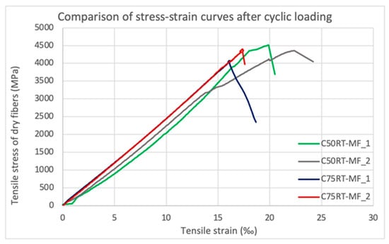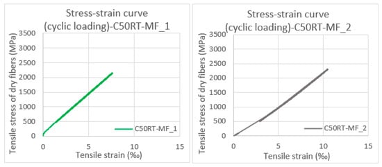Specimens C50RT-MF_1-2 and C75RT-MF_1-2 were submitted to fatigue tests of fifty loading–unloading cycles with a maximum load of 50% and 75% of the average tensile strength, respectively. Resulting from the monotonic, uniaxial tension that followed, the average tensile strength of dry fibers was 4438.88 and 4237.14 MPa for the C50RT-MF_1-2 and the C75RT-MF_1-2, respectively. Consequently, the repeated loading up to a level of 50% did not affect the specimen’s ultimate strength. Whereas when the loading reached 75% of the ultimate strength, the maximum stress was recorded as 3.94% smaller than the reference strength.