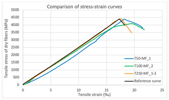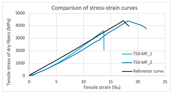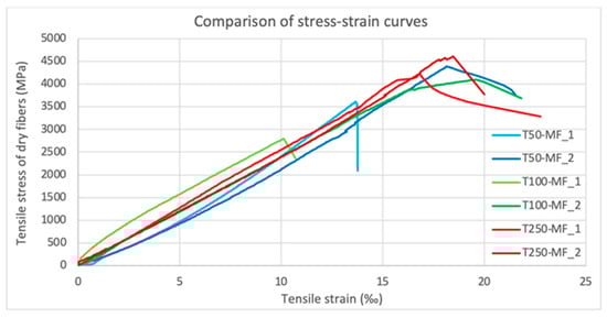 Consequently, it is established that when exposed to elevated temperatures, at a max of 50 °C, CFPRs lose their tensile strength, whereas when they are left to cool down and are under stress, their strength remains the same. More specifically, the tensile strength of dry fibers of the sample T50-MF_1 decreased by 18.04% and its elastic modulus of dry fibers increased by 3.69%. The stress–strain curves of T50-MF_1 and T50-MF_2 are shown in Figure 15.