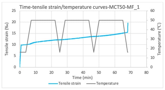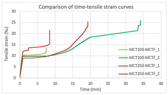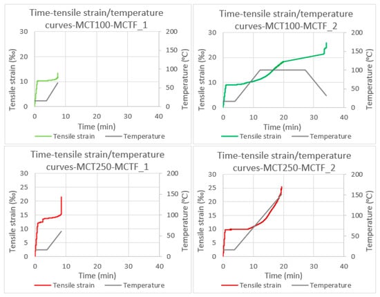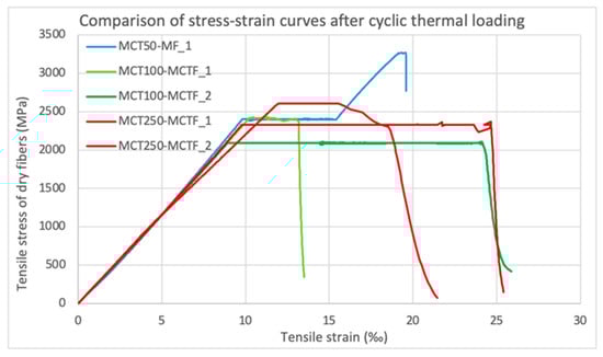 The specimens MCT50-MF_1, MCT100-MCTF_1-2 and MCT250-MCTF_1-2 were under both constant tensile service load (50% of the maximum) and thermal loading of a maximum of three heatin–cooling cycles. The stress–strain curves of these tests are shown in Figure 12.