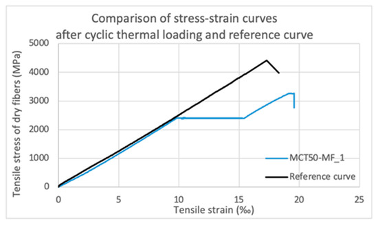 The following stress–strain graph is the average graph of the five control specimens (MRT-MF_1-5), which were monotonically loaded at room temperature up to failure. (fu,ave,fibers = 4410.82 MPa, εave,fibers = 17.29‰ and Εave,fibers = 255.12 GPa, see Table 6). The average graph depicted in Figure 13 will be used as a reference curve and be compared with the equivalent curves that exhibit thermal constrains and low-cycle fatigue.