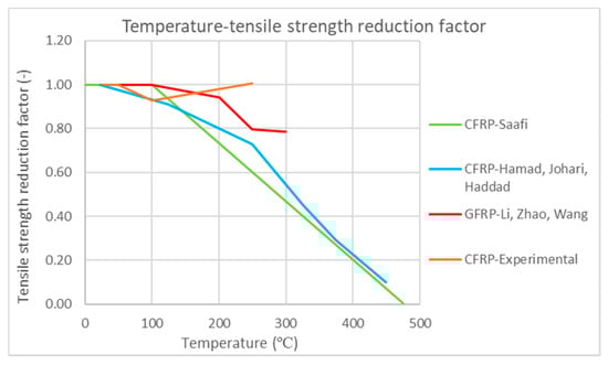 The tensile strength of FRPs is important, as it is required to calculate the load-bearing capacity of reinforced elements [7]. The research of Sen et al. (1993) on the tensile strength of various types of glass fiber-reinforced polymers (GFRP) at different temperatures concluded that glass fibers lose about 50% of their initial tensile strength above 550 °C [7,31]. Carbon fibers, on the other hand, have higher resistance to high temperatures [7,31]. At the same time, they do not show any change in their tensile strength at temperatures higher than 1000 °C [7,31].
