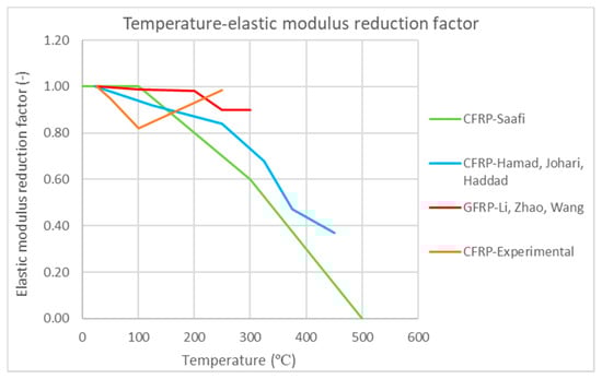 Temperature–elastic modulus reduction factor curves [18,23,30].