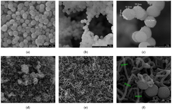 SEM images of (a) silica microspheres; (b,c) silica microspheres with iron oxide nanoparticles at different magnifications; and (d–f) SiO2@CNTs at different magnifications.