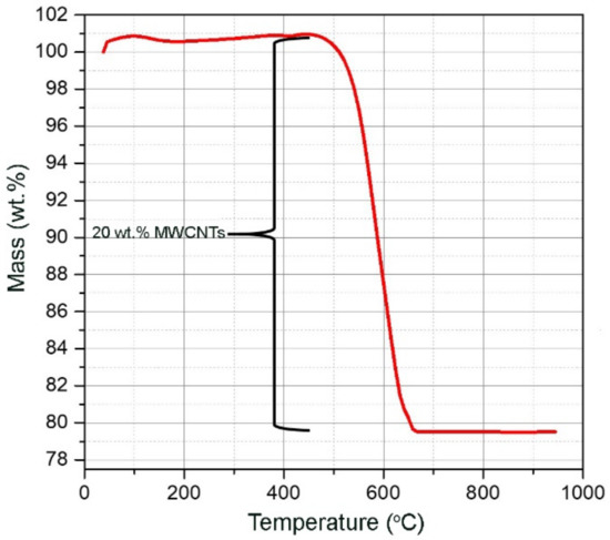Raman and TGA analyses were performed for the quantitative determination and qualitative identification, respectively, of the structural defects of MWCNTs on the SiO2@CNTs hybrid structures. Figure 4 presents the results of the TGA analysis. It is shown that at approximately 100 °C, a minor mass increase can be observed (0.8 wt.%), which is attributed to the initial oxidation. According to Mansfield et al., amorphous carbon thermal degradation occurs between 200 and 400 °C. Therefore, taking into account that no mass loss can be seen in this temperature range, it can be assumed that the SiO2@CNTs sample has no amorphous carbon [24,25]. The thermal degradation of the sample initiates at 463 °C and ends at 670 °C, having lost 20 wt.% of its total mass. From there on, the mass remains constant up to 900 °C, where the measurement is finished. This mass loss is attributed to the thermal oxidation of MWCNTs, which occurs above 450 °C in air [26]. According to the literature, above the aforementioned temperature under an oxygen atmosphere, the graphite layers of MWCNTs become unstable and begin to degrade; this outcome has been observed during the heating of MWCNTs at various heating rates [27]. Evidently, the TGA measurements revealed a 20 wt.% MWCNTs content with minor to no amorphous carbon content.