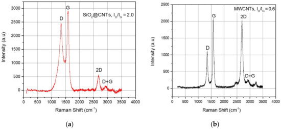 Raman shift of (a) SiO2@CNTs and (b) pristine commercial MWCNTs.