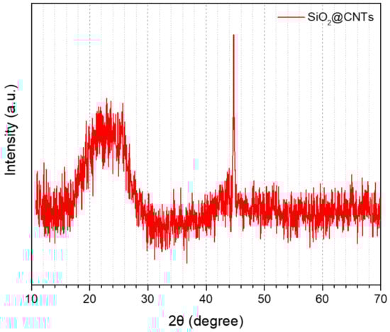 To further support the presence of MWCNTs on the as-produced silica surface, XRD measurements took place in order to identify any crystal structures present on the sample as evidence of MWCNTs; the results are presented in Figure 6. The XRD spectrum exhibits one broad and one sharp peak located at approximately 25 degrees and 43 degrees, respectively. According to the literature [28], amorphous nano-silica exhibits a broad peak with a center at approximately 25 degrees, which agrees with our findings since in the TGA measurements, it was shown that the sample consists primarily of silica (80%). Nevertheless, MWCNTs exhibit two main peaks, the first one located at 23 degrees and the second one at 43 degrees, responsible for the diffraction of the crystal graphitic planes (002) and (100), respectively [29,30]. Although the first peak is most likely overlapped by the strong diffraction of the amorphous silica, the second peak at 43 degrees is a sharp peak with a strong intensity, clearly denoting evidence of crystal structures in the SiO2@CNTs sample.