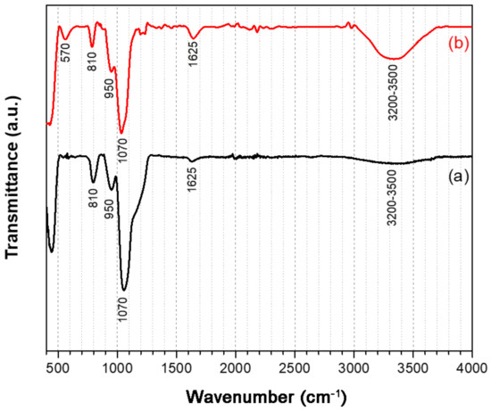 According to the literature, the catalytic activity for the growth of MWCNTs is provided by transition metal particles—in our case, elemental iron [31,32]. For this reason, after the functionalization of the hydroxyl groups of colloidal silica with iron chloride aqueous solution by means of electrostatic interaction, the produced iron oxide nanoparticles undergo reduction to elemental iron during the reduction process with H2 at 700 °C. FT-IR analysis was performed on the pristine silica microspheres and on the silica microspheres after the functionalization with iron chloride and their calcination at 700 °C (Fe+—functionalized silica microspheres). The results are illustrated in Figure 7. Figure 7a exhibits the FT-IR spectrum of the pristine silica microspheres; the absorption band at 810 cm−1 is attributed to Si–O–Si stretching. The absorption bands at 1070 cm−1 and 950 cm−1 are assigned to the siloxane vibration, whereas the bands at 3200–3500 cm−1 and at 1625 cm−1 are attributed to the O–H stretching band of either the hydroxyl groups of the silica microspheres or the water molecules present in the sample [33]. Figure 7b depicts the FT-IR absorption spectrum of the silica microspheres after the growth of iron oxide nanoparticles. The spectrum exhibits all the previously observed bands of the silica structure with the addition of one more peak located at 570 cm−1, which, according to the literature, is an indication of the vibration of Si–O–Fe–O [34]. The aforementioned results in relation to the EDS analysis (Figure 3) clearly denote the presence of iron oxide on the surface of the silica microspheres.