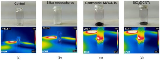 Taking into account the obtained results, it can be observed that the silica spheres exhibit a slightly increased temperature (59.2 °C) compared to the control sample, whereas the pristine commercial MWCNTs and the SiO2@CNTs exhibit elevated temperatures, 209 °C and 173 °C, respectively. Furthermore, it can be seen that there is an increase in the temperature scale bar limits, from the control to the rest of the samples, from 33.4–189 °C up to 64–280 °C, indicating that the silica microspheres, pristine commercial MWCNTs and the hybrid SiO2@CNTs contribute to heat production. On the other hand, it may be remarked that despite the fact that the SiO2@CNTs contain the same amount of MWCNTs as the pristine commercial MWCNTs, there is a difference in the observed temperature (~30 °C). This variance in temperature can be attributed to the difference between the Id/Ig ratios of the MWCNTs, as observed in the Raman analysis (Figure 5). It has been previously reported that morphological factors such as structural defects, aspect ratio, specific surface area and purity are prevailing factors that dictate the microwave absorption of carbon nanotubes [35]. In addition, considering that defect-free SWCNTs have been previously microwave irradiated in a similar manner and their heat production was significantly higher, the above hypothesis can be further supported [10].
