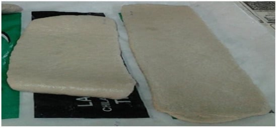 Composite materials were prepared by using a two-roll mill (150 × 300 mm) INDEXPELL Model no. IEW/M-1 at ambient temperature with 1:1.25 frictional ratio under American Society for Testing and Materials (ASTM) D 3184-11 standard. The characteristics of the two-roll mills were roller diameter = 150 mm, face width = 300 mm, motor = 7.5 HP, 1440 rpm, batch capacity = 3 kg, and reduction gear ratio = 40:1. The necessary quantities were added into a mill opening of 1.5 mm. The values were selected to increase the fiber orientation in the mill direction. The natural rubber was masticated in the mill for a few minutes, after which the ingredients were added. The fibers were mixed thoroughly and added to the end of the mixture, taking care to maintain the direction of the flow of the compound, so the majority of the fibers followed the direction of flow. This is a procedure that was necessary to not excessively fragment the fibers during mastication []. Later, after completed mixing, the rolled sheet was pulled out through a 0.8-mm tightly fixed nip gap at the end of the lap six times and finally left at a 3-mm nip gap. The other composition parameters, like mill/roll speed ratio and temperature, were similar for all sets of observations. The aspects of the compound, as that from Figure 2, reported a non negligible thickness variation, which will likely represent a problem when dealing with natural fiber introduction, such as phormium, which are dimensionally variable as well in nature. The compounds for their respective optimum curing times t90, reported in Table 2, together with other parameters for curing, obtained using the oscillating disc rheometer (ODR) test, were vulcanized to 150 °C with hydraulic pressure, as detailed below. It is noteworthy that no particular and clear influence of the fiber length and quantity is noticed, so these parameters are only reported for completeness. Due to the method purposely adopted, pre-vulcanization of sulfur is likely to occur; therefore, mixing of the compound did not exceed around 2–3 min, slightly depending of course on the amount of phormium fiber introduced.