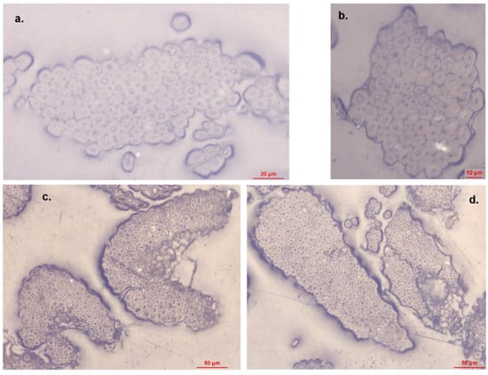 The phormium fiber morphology is observed in Figure 3 from the optical microscopy transverse observation of their cross sections, along the lines of the method suggested in []. The images suggest that their typical structure is as a collection of polygonal cells, for which the shape is not far removed from the quasi-hexagonal section characteristic of flax fibers []. Four shapes are tentatively identified, also based on previous studies []: elongated, quasi circular, horseshoe, and keyhole. In all of these, the presence of lumens appears to represent a considerable portion of the whole section. This, added to the fact that most fibers have a section with quite distant geometry from a circular one, suggests the significance of possible errors in the evaluation of the tensile strength of the composite.