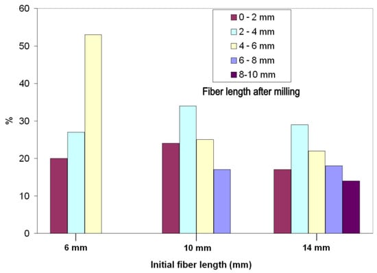 Another source of possible inaccuracy is given by the fact that, during processing of the rubber composite, phormium fibers are broken by the effect of rolling mills due to the fact that shear force takes place when mixing most of the fiber in the direction of the mill grain. A number of factors influence it, such as the initial rate of damage, the magnitude of stress and strain, and obviously the type of fiber. The fiber diameter hardly changes during processing, especially if the natural fiber is sufficiently hard []. The results on fiber breakage are reported in Figure 4, which indicate that, of the three fiber lengths used, the shortest one, 6 mm, suffered the least fragmentation whilst the longest one, 14 mm, was basically always reduced in length by processing. For this reason, verification in a subsequent experimental work was suggested to examine whether it was possible to increase the amount of 6-mm fibers introduced in the composites or if the advantage obtained from using longer fibers would justify a future intervention on processing to make it more suitable for the introduction of phormium fibers.