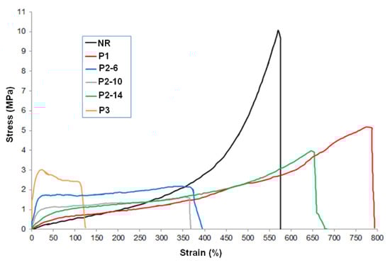 Another possible suggestion is that the occurrence of SIC would confer to the rubber more strength at lower strains, as verified with pineapple leaf fibers []. The virtual absence of an increase of stress at higher strains, therefore resulting in a “flatter” curve, is especially encountered in the case of the P2-6 and P3 curves, when more than 10% of 6-mm-long fibers were added. On the other hand, the notably high elongation typically offered when introducing 14-mm-long fibers in the matrix may indicate that the capacity to bend and generally curve longer fibers is possibly beneficial when obtaining a higher strain.