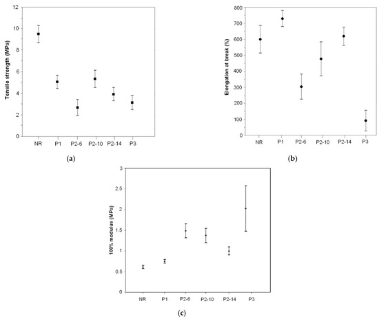 Tensile properties of the different rubber matrix composites: (a) tensile strength (MPa) (average and standard deviation), (b) elongation at break (%) (average and standard deviation), and (c) 100% modulus (MPa) (average and standard deviation).