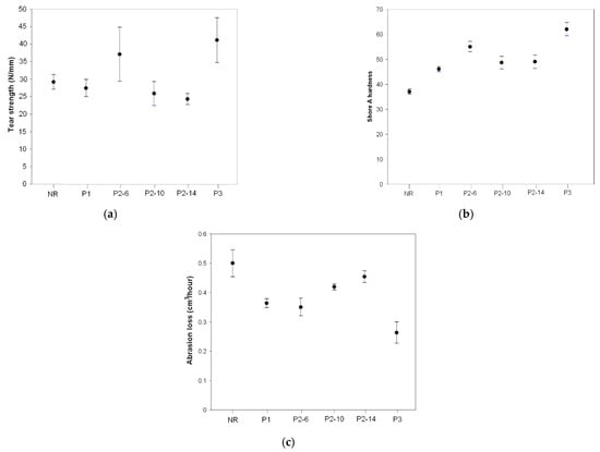 Other properties of the different rubber matrix composites: (a) tear strength (N/mm) (average and standard deviation), (b) Shore A hardness (average and standard deviation), and (c) abrasion loss (cm3/h) (average and standard deviation).