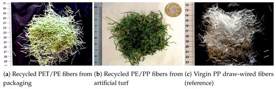 RP fibers, illustrated in Figure 1a and Figure 2a, consist of a blend of PET/PE (designed in accordance with PlasticFiber Srl, Bologna, Italy). This polymeric mixture was retrieved from processing disposed food packaging, then milled, and eventually extruded as cylindrical-shaped draw-wired fibers 1 cm long (diameter 0.70 mm).