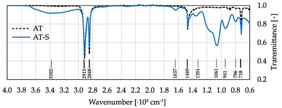 To assess the efficiency of the silica coating, we first conducted FT-IR analyses on both treated AT-S and uncoated reference AT fibers. The comparison between the observed surface spectra is reported in Figure 3.