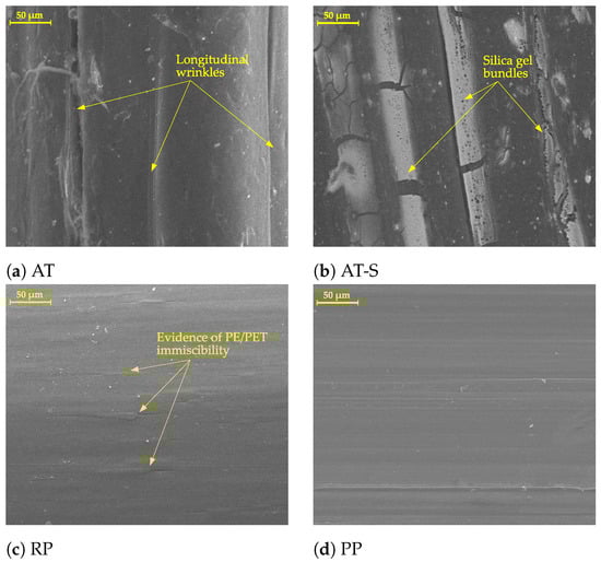 For the sake of completeness, in Figure 4c,d, we also report the detail of RP and PP fibers, respectively. As expected, such kinds of fibers present a very smooth surface, and only axial grooves are observed, as a direct consequence of the extrusion process. A higher magnification is also displayed in Figure 5c,d, the first showing the presence of some superficial asperities on RP surface, which may be ascribed to the immiscibility of PE and PET within the blend [48].