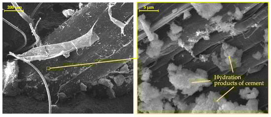 Further detailed views of AT and AT-S fibers are reported in Figure 5a,b, respectively. The distribution of the silica coating on the surface turns out to be uneven, fractured, and porous. The adhesion of the coating seems to be affected by the grooved morphology of the fibers, with the superficial wavy texture channelling the coating along the longitudinal wrinkles. This behavior is in perfect agreement with the observations by Signorini et al. [33], who investigated the effect of a similar rapid acid-catalysed silica coating on PP fibers. We remark that, because of both very smooth morphology of polyolefin surface and their chemically inert nature, an optimal adhesion of the coating would require quite long treatments, as pointed out by Di Maida et al. [39]. However, the choice of a rapid treatment represents a compromise between adequate effectiveness of the coating and its possible incorporation in industrial processing. The quality of the AT-S fibers-to-matrix adhesion is also clearly highlighted in Figure 6, which displays the AT-S fiber partially pulled out from the cement matrix in a failed specimen. Numerous bundles of hydration products of cement, with their peculiar acicular shape, remain firmly attached to the surface of fiber, even after pull-out (friction) occurrence. This bond is fostered by the presence of the thin silica hydrophilic coupling layer [33].