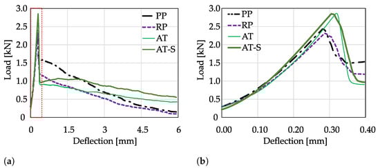 Analysis of Figure 8a confirms once more the crucial role played by the shape of fibers in the crack formation process. Cylindrical PP and RP fibers attain approximately the same ultimate load, while flattened AT and AT-S filaments increase this reference value by 11.4% and 19.0%, respectively. Therefore, flattened fibers permit to reach higher flexural strength, accordingly to the observations by Marthong [51], who employed hand-cut PET bottles as reinforcing platelets in concrete.