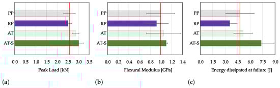 Bar-charts of: peak load (a); flexural modulus (b); dissipated energy (c), along with the standard deviation bands.
