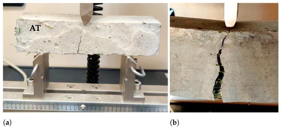 Accordingly to the previous observations, we also highlight that the sewing effect of the fibers gets in the game only once the tensile strength of the mortar is attained at the intrados of the specimen, with the main crack triggering at the mid-span. Typical bending cracked stage (Figure 9a) and failed specimen (Figure 9b) are illustrated in Figure 9, the latter making evident the bridging role of the fibrous reinforcement. Remarkably, this mechanism dramatically fosters the dissipation capability of the composite, which likely represents the most important performance index in the field of FRCCs and FRCs [54]. After the attainment of the flexural bearing capacity of the mortar (i.e., when the first cracking occurs), fiber-to-matrix interphase interactions start to drive the FRCC mechanical response [55].
