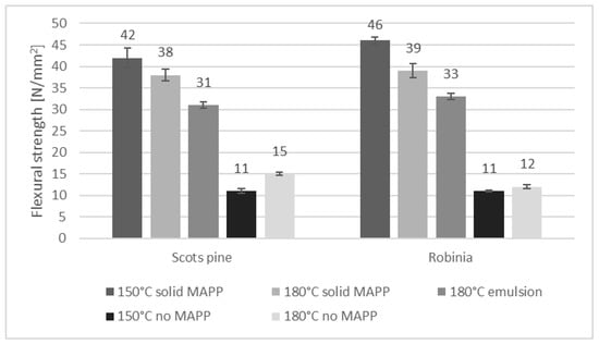 Flexural strength of composites with TMP based on Scots pine or Robinia. For comparison, flexural strength of composites with wood flour (softwood) was 50 N/mm2 including MAPP (solid) and 16 N/mm2 excluding MAPP.