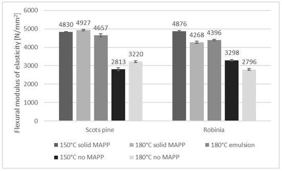 Flexural modulus of elasticity (MOE) of composites with TMP based on Scots pine or Robinia. For comparison, flexural MOE of composites with wood flour (softwood) was 6202 N/mm2 including MAPP (solid) and 4047 N/mm2 excluding MAPP.